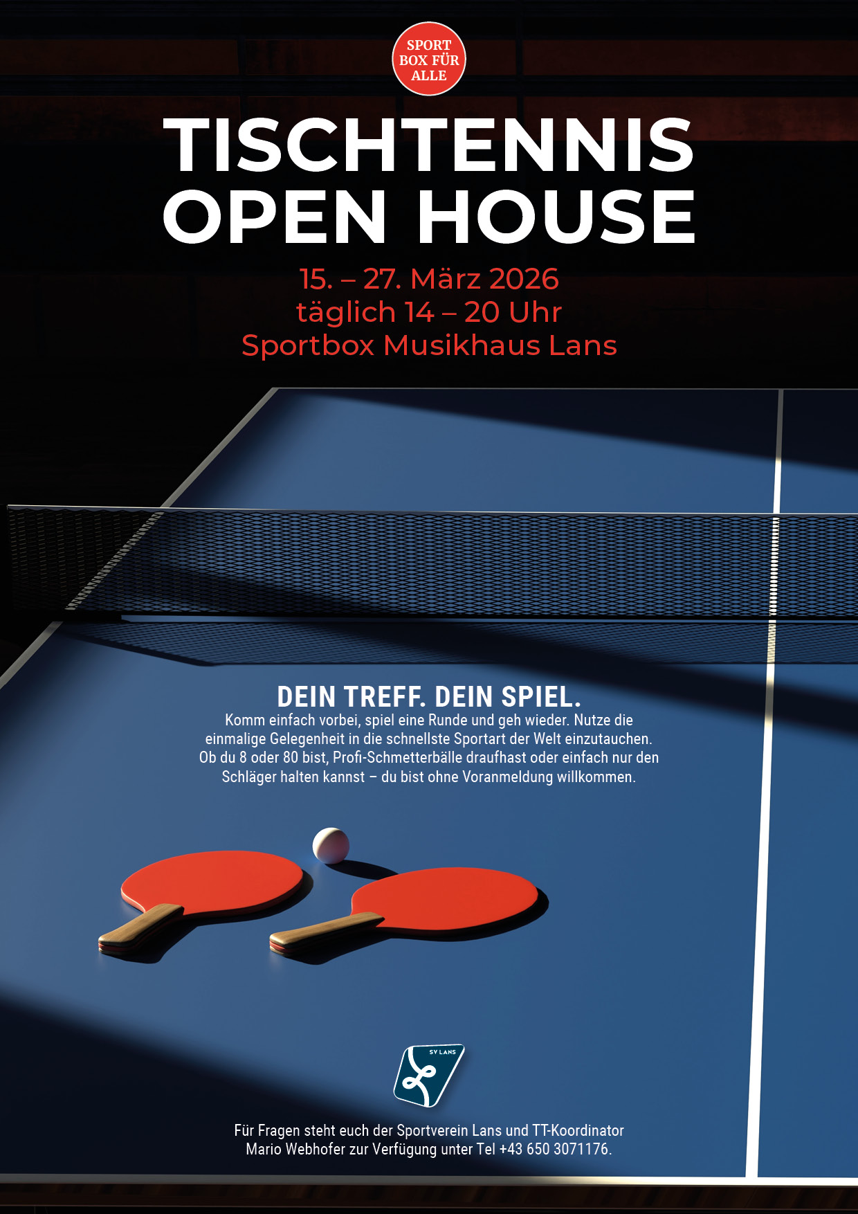 Ambitionierte erwachsene Hobbyspieler:innen treffen sich jeden Montag und Donnerstag zum Tischtennisspielen. In lockerer Atmosphäre spielen wir auf insgesamt 7 Tischen ohne Anleitung eines Trainers mit- und gegeneinander. Neueinsteiger können jederzeit auf eine Schnuppereinheit vorbeischauen. Weitere Infos gibt es bei Coach Mario unter 0650 3071176.